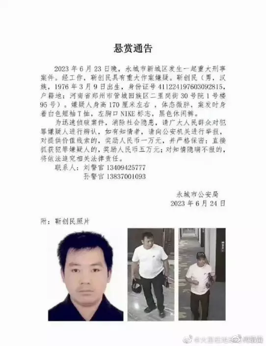 河南永城警方上周六(24日)發布《懸賞通告》顯示,前一晚(23日),永城市新城區發生一宗重大刑事案件,靳某民具有重大作案嫌疑。25日內地記者從永城警方證實,靳某民是中國書法家協會會員、中國書畫家協會會員。事件引起網民議,更多有關案件的資料亦相繼流出。