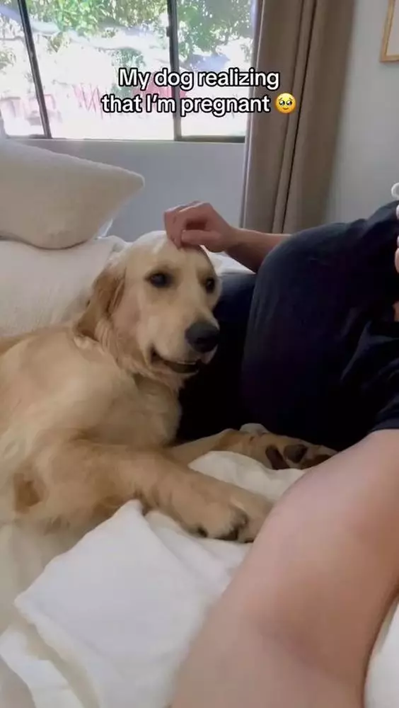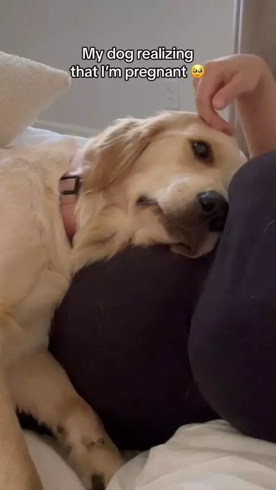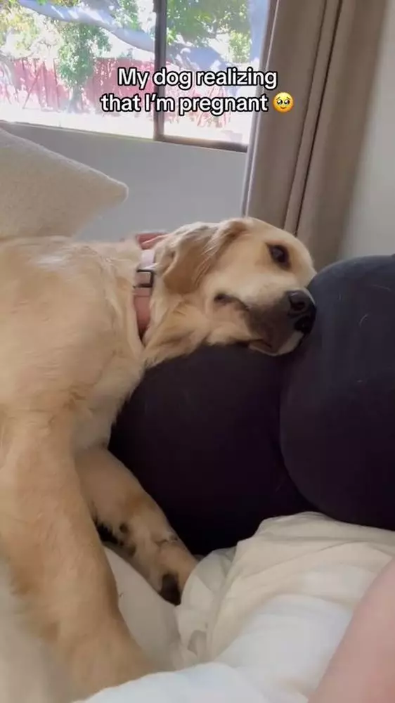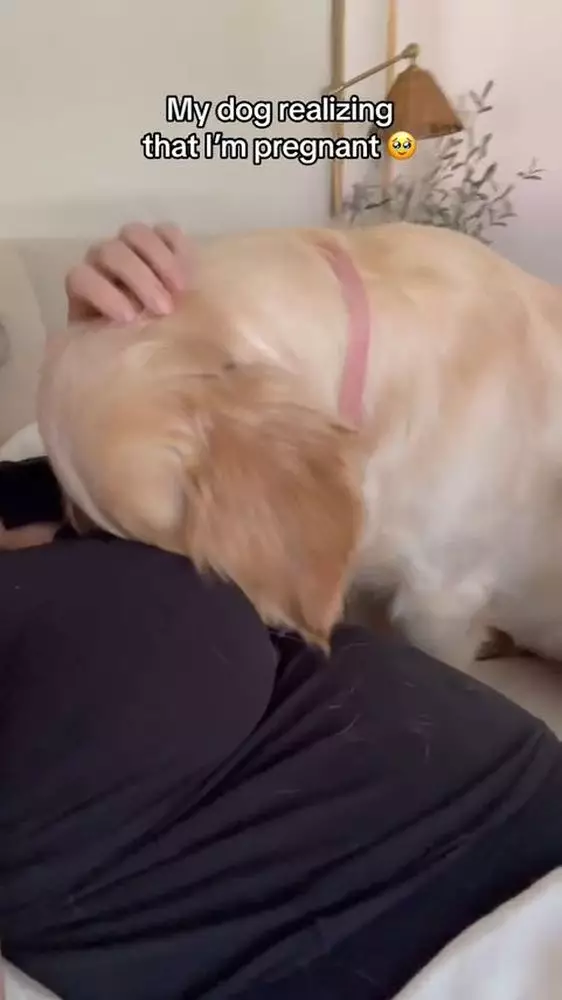 室內設計師Liz Lovery養了兩隻金毛尋回犬「Teddy」和「Winnie」,並將於今年8月迎來新生命,想不到原來狗狗們都意識到她懷孕了!Liz分享影片,可見她當時正半躺在沙發上休息,Winnie則靠在她的孕肚上,當Winnie感受到胎動時,即露出震驚的表情,然後開始臉磨蹭孕肚,好像在安撫小主人,之後又露出超溫柔眼神,並繼續依偎在孕肚上,好像在告訴小主人牠會一直陪伴在身邊。