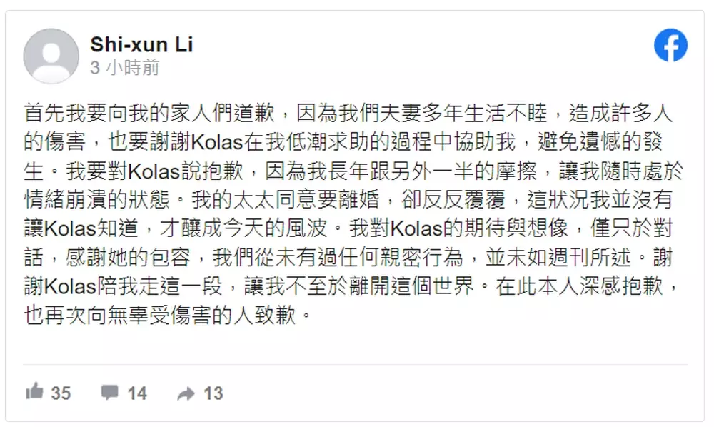 與Kolas發生不倫戀的李男28日透過Facebook道歉。FB圖