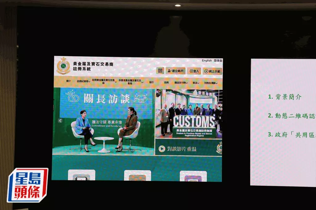 海關自4月起引入貴金屬及寶石交易商註冊制度,任何有意在香港經營貴金屬及寶石業務,並在業務過程中在香港進行總額為12萬或以上港元的交易,須向海關關長註冊。為方便業界,香港海關提供網上申請服務,交易商成功註冊後,將獲發註冊證明書,每張註冊證明書上均印有註冊二維碼及註冊編號。交易商若需向客戶證明註冊身份,可登入系統並展示一個為時30秒的限時動態二維碼,客戶掃描後即可顯示交易商公司名稱、註冊號碼及項目。