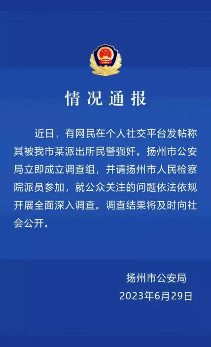 江蘇揚州警方29日官方微信公眾號「揚州警方」發布通報,近日,有網民在個人社交平台發文稱其被揚州市某派出所民警強姦。揚州市公安局立即成立調查組,並請揚州市人民檢察院派員參加,就公眾關注的問題依法依規開展全面深入調查。調查結果將及時向社會公開。