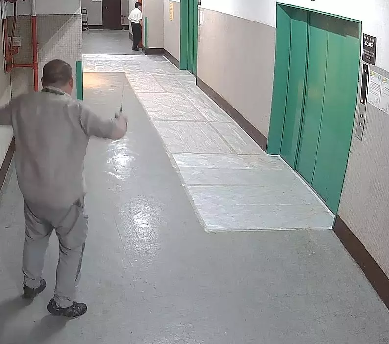 當日閉路電視可見,大廈保安員在走廊巡邏期間,背後突出現一名男子。男子一直身後揮舞雙刀,興高采烈唱歌,惟保安員「冷待」男子,即使兩度回頭仍以不變應萬變。最後保安員推開防煙門離開走廊,舞刀男返回單位,事件中無人受傷。