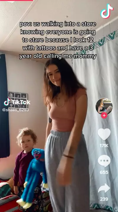 有長相童顏的外國母親在TikTok拍影片分享自己的育兒生活,指出與仔仔在外面進行互動時,路人總是以不友善的眼神注視,因此為母感到困擾「走在外面總有人盯著自己看,而自己看起來像個有紋身的12歲女孩,卻有個3歲的男孩叫我媽媽」。其實看起來像12歲的當事人雪伊(Shae)已經21歲,養育著一名3歲的兒子諾亞(Noah)。