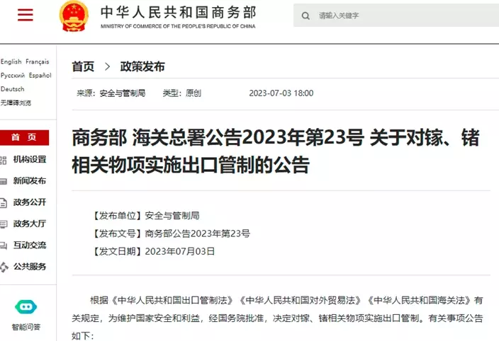 根據公告,對鎵和鍺兩種金屬相關物項的出口管制將於8月1日起正式實施。