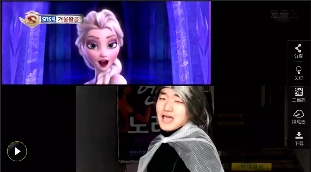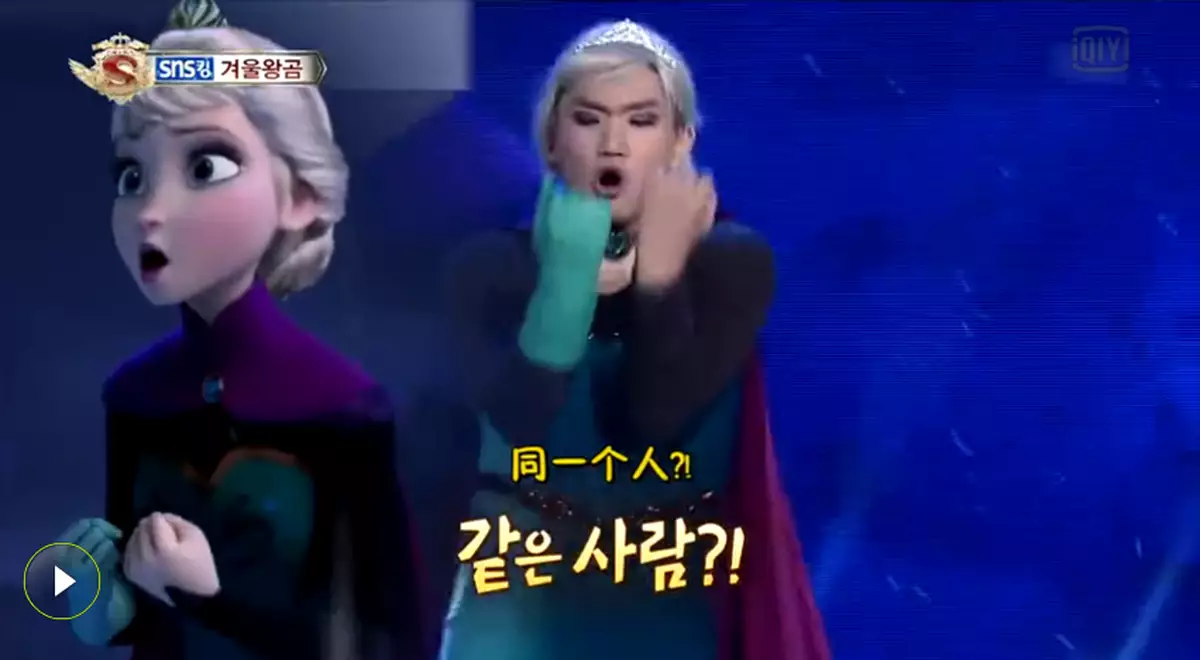 迪士尼電影《魔雪奇緣》一炮而紅,在網絡出現許多cosplayer爭相模仿。而南韓一位相貌平平的男生載歌載舞模仿艾莎女王,不僅神級咪嘴勁唱主題曲《Let it go》,更將女王的每一個動作,每一個神情都模仿得惟妙惟肖,在YouTube上迅速創下200萬點擊。