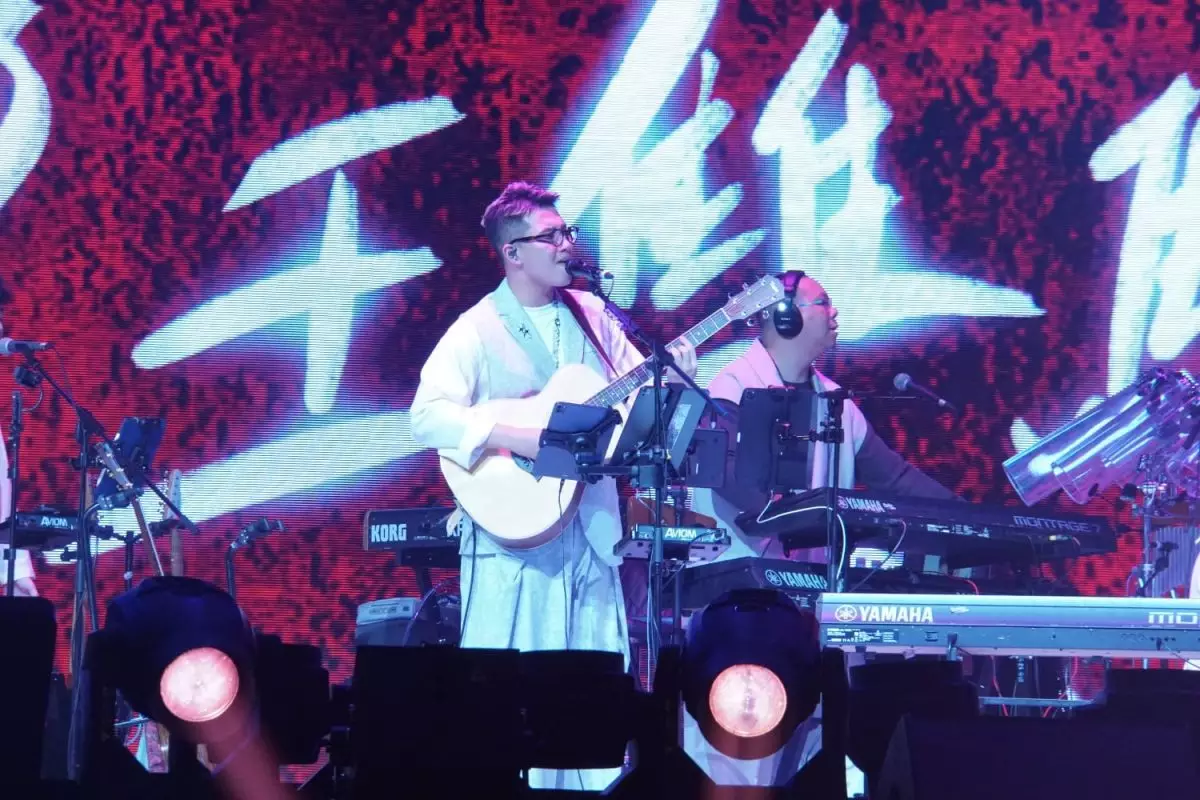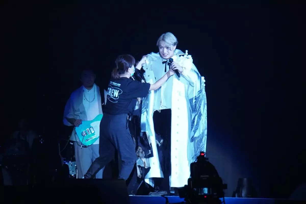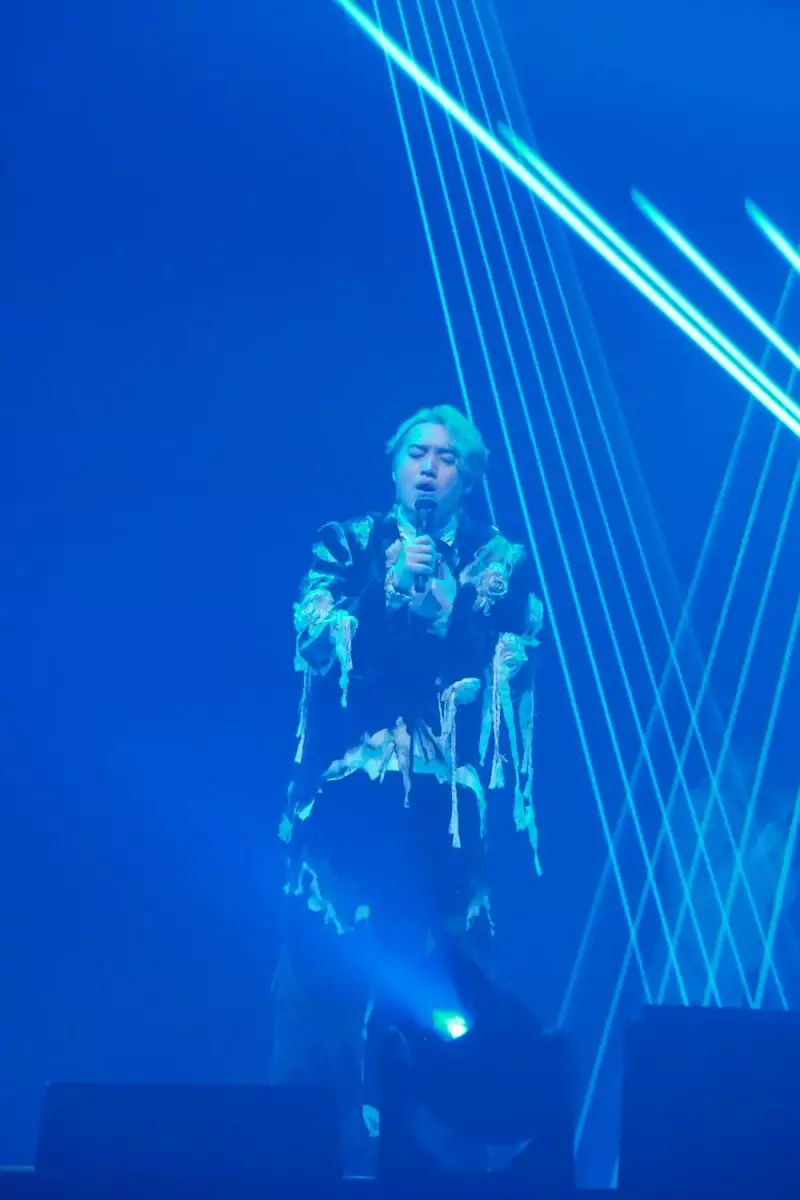 之後他換上閃令令斯文套裝,續為大家帶來《水邢物語》、《迴光物語》、《風靈物語》、《砂之器》,見Jer企在水藍色波紋背面前,特別有Feel!本網攝記攝
