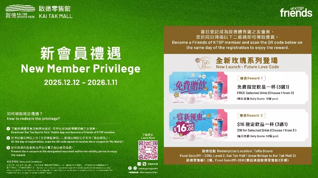 即日起至 2026年1月11日,於同日首次登記成為「啟德體育園之友」會員,並掃描啟德零售館場內活動之二維碼即可領取以下獎賞。