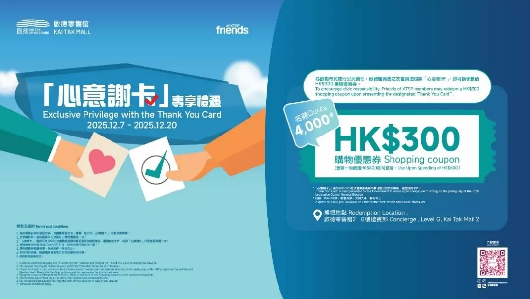 即日起至 2025 年 12 月 20日,「啟德體育園之友」會員憑投票「心意謝卡*」,即可換領價值港幣$300 啟德零售館購物禮券乙張。購物優惠券數量有限,先到先得,換完即止。