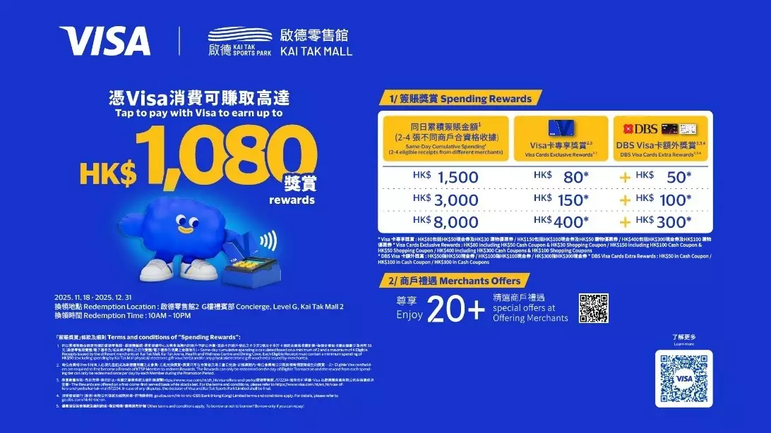 即日起至 2025 年 12 月31日,憑 Visa 卡於啟德零售館、啟德體藝館、運動健康中心及美食海灣內指定商戶簽賬,可享高達港幣$1,080 的簽賬獎賞(包括現金券及購物獎券)。超過 20 間精選商戶禮遇,盡享美食、運動及時尚等優惠。