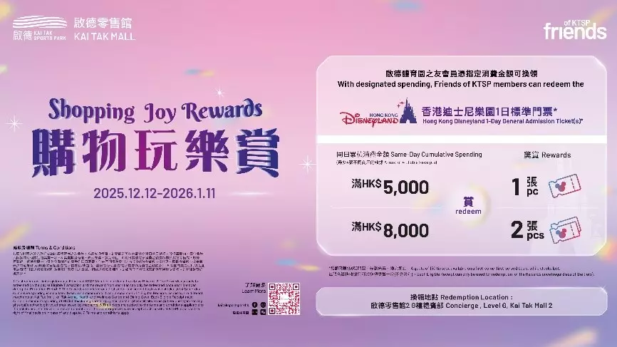 即日起至 2026 年 1 月 11 日,「啟德體育園之友」會員於啟德零售館、啟德體藝館、運動健康中心及美食海灣內指定商戶同日累積消費滿港幣$5,000,即可換領香港迪士尼樂園門票1張;滿港幣$8,000 可換領2張。名額有限,先到先得,讓你將這份奇妙快樂延續至香港迪士尼樂園!
