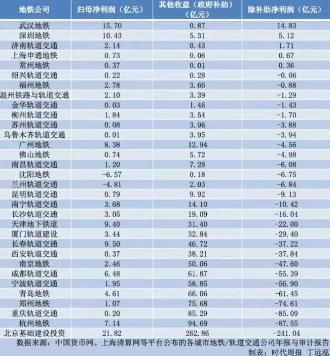 不過,北京地鐵的其他收益達到262.86億元,兩相減除後,北京地鐵除補助淨利潤為-241.04億元,成為了唯一虧損超百億的城市。