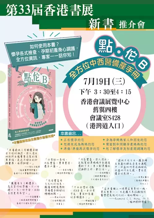 香港書展即將開鑼,全港首本結合中西醫、心理學和基因學等專業的養生安胎指南《點.佗B 全方位中西醫備產手冊》,將於7月19日下午3時30分在香港書展舉行新書推介會。 主創團隊表示,孕育一個生命非常不容易,希望通過「貼地」的介紹,幫助更多家庭科學備孕。另外,書本所有收益會作慈善用途,回饋社會。