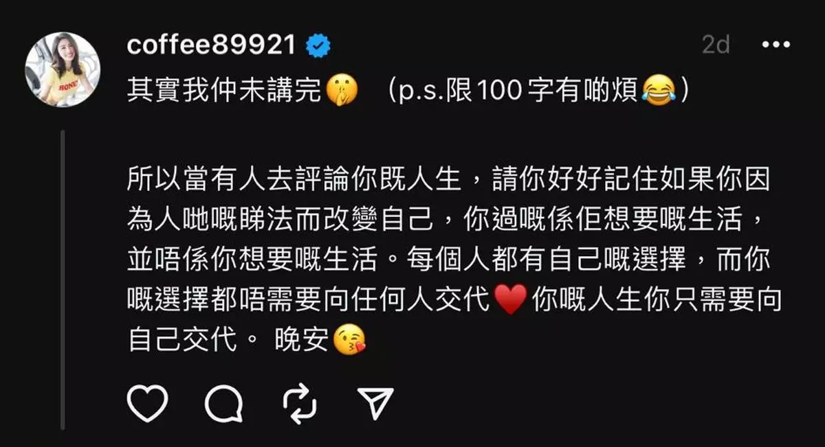 最後,Coffee提醒大家,當有人評論你的人生,請你好好記住,如果你因為別人的看法而去改變自己,你過的只是對方想要的生活,並不是你想要的生活,「每個人都有自己嘅選擇,而你嘅選擇都唔需要向任何人交代你嘅人生你只需要向自己交代。」