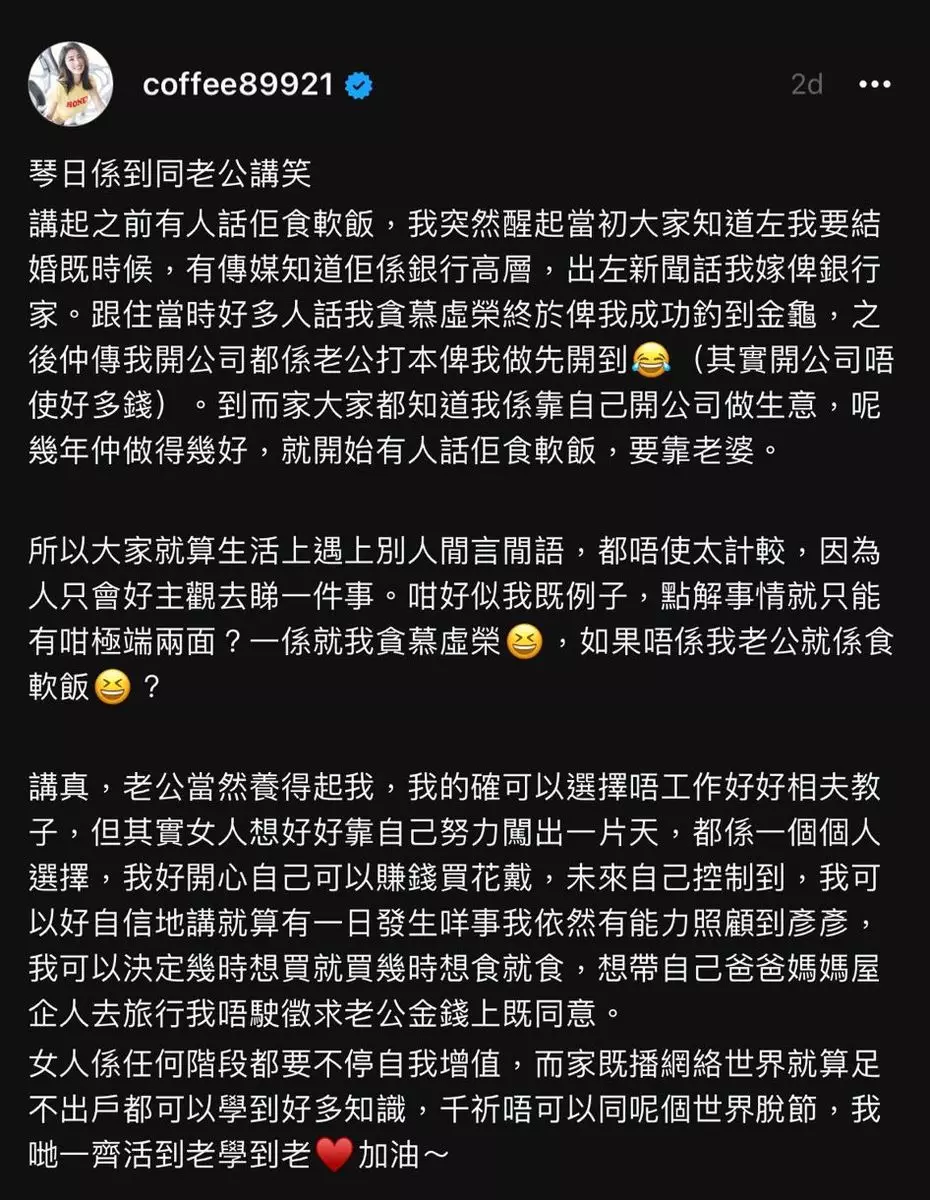 Coffee更直指老公養得起她,「我的確可以選擇唔工作好好相夫教子,但其實女人想好好靠自己努力闖出一片天,都係一個個人選擇,我好開心自己可以賺錢買花戴,未來自己控制到,我可以好自信地講就算有一日發生咩事我依然有能力照顧到彥彥,我可以決定幾時想買就買幾時想食就食,想帶自己爸爸媽媽屋企人去旅行我唔駛徵求老公金錢上既同意。 女人係任何階段都要不停自我增值,而家既播網絡世界就算足不出戶都可以學到好多知識,千祈唔可以同呢個世界脫節,我哋一齊活到老學到老♥️加油」。