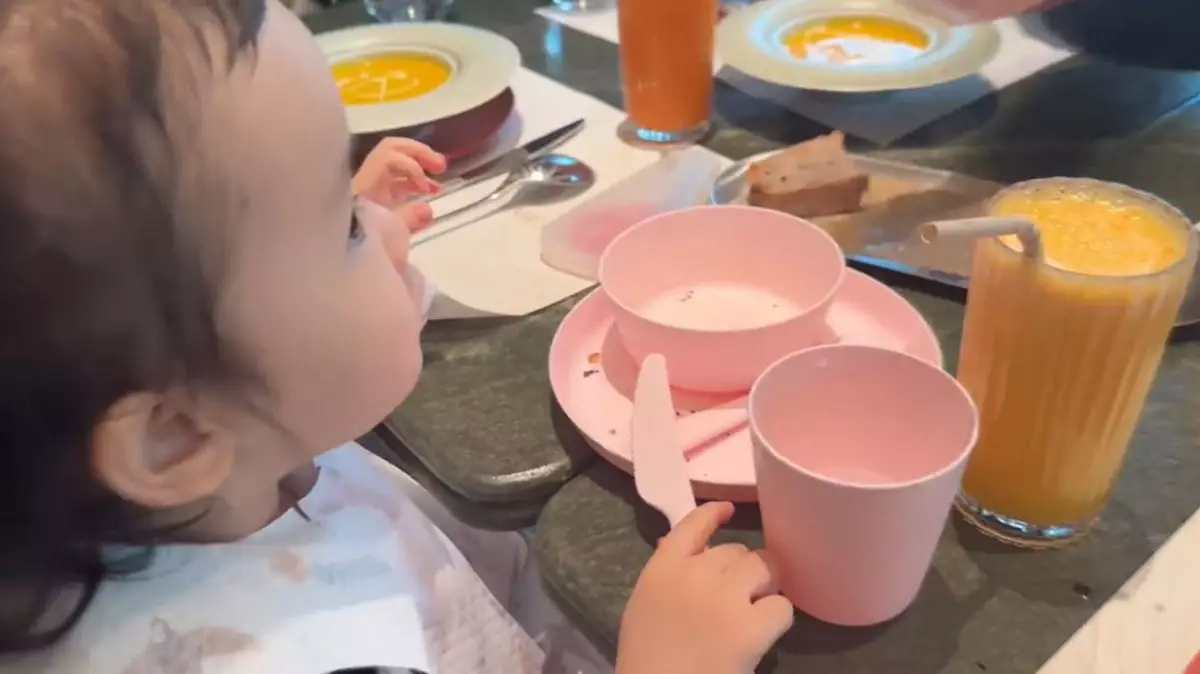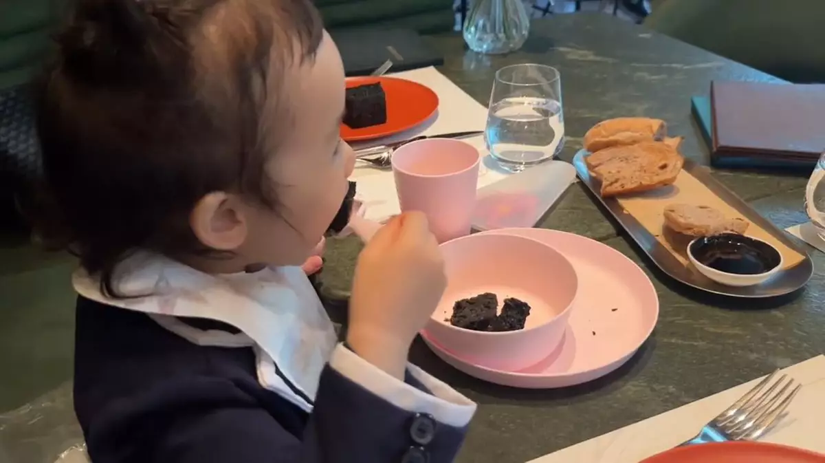 之後,一家人就去了西餐廳慶祝,可以聽得出小Luna說話已經很流利,又樂於表達自己的喜好,不但全程乖乖自己進食,還會分享給爸爸媽媽,可見張馨月將囡囡教育得很好。