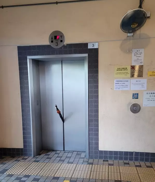 有時為了不讓𨋢門太快關上,很多人都會用手或用隨身物品擋一擋。有葵青街坊早前發帖,稱在葵涌邨落大窩口電梯塔內,其中一部壞𨋢插住長遮,令𨋢門無法徹底關上,中間漏了條隙縫,引來網友熱議。