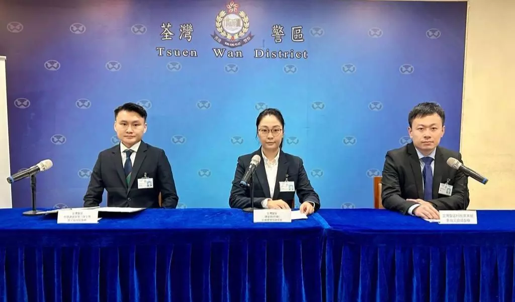 (左起)荃灣警區刑事調查隊第二隊主管張文迪、荃灣警區署理刑事總督察莊婉娜、荃灣警區科技罪案組幫辦麥海文