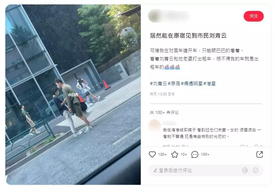 有網民在小紅書分享在日本偶遇劉青雲與郭藹明的照片,並留言:「居然能在原宿見到市民劉青雲,可惜我在對面車道開車,只能眼巴巴的看著。看著劉青雲和他老婆打出租車,恨不得我的車就是出租車的」。照片中可見,二人都戴著口罩,而且打扮悠閒,郭藹明正在低頭按電話,而劉青雲則站在老婆身邊,手上還拿着一袋二袋和漁夫帽,完全不用老婆動手,網民都讚他絕對是貼心好老公!
