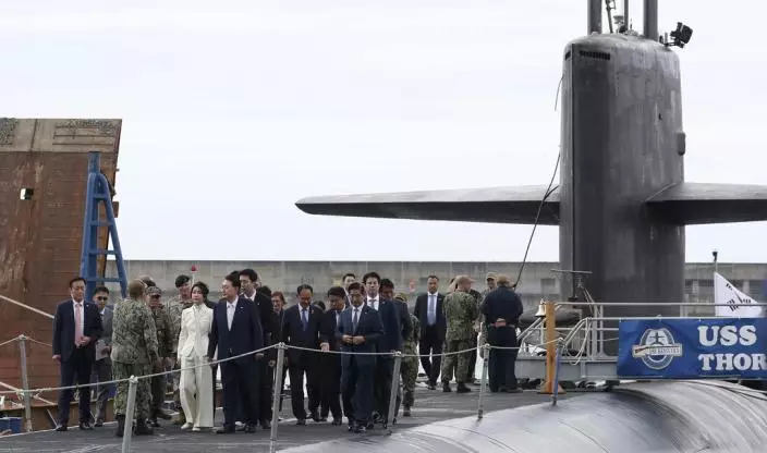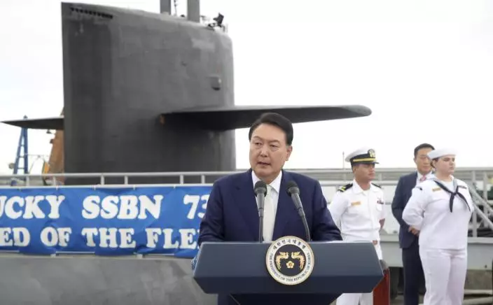 南韓總統尹錫悅19日登上停靠在釜山港的美軍戰略核潛艇肯塔基號,並參觀潛艇內部。
