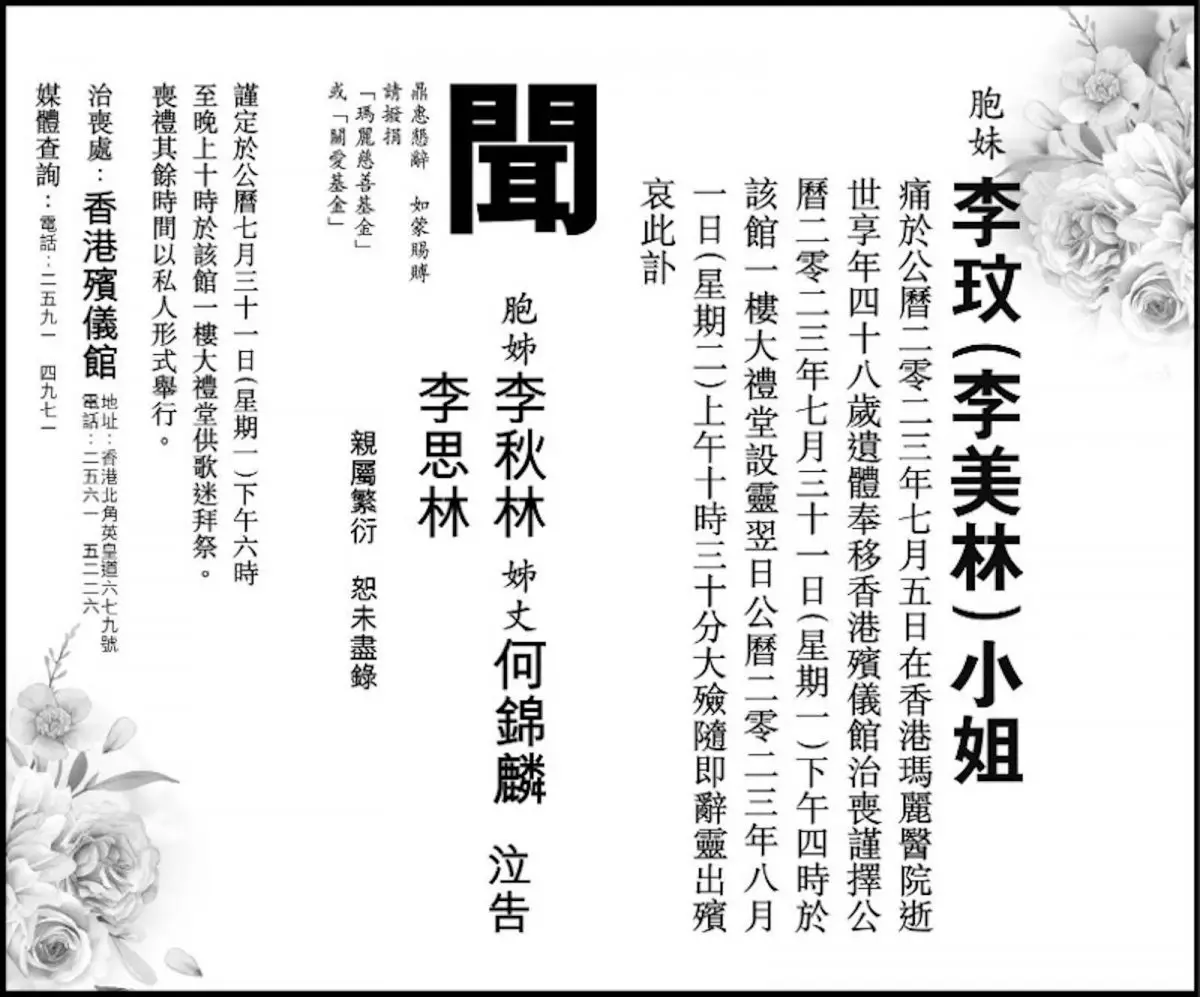 華語樂壇天后李玟(CoCo)日前7月5日驟逝,她的離去讓各界大感震驚。家姐李思林為她刊登訃聞,公布喪禮詳情。上面有兩位家姐李思林和李秋林,以及李秋林丈夫何錦麟的名字,獨欠Coco的富商老公Bruce的名字。