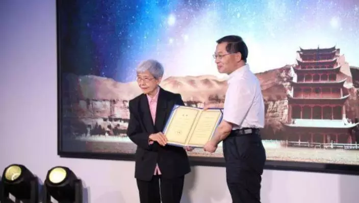 7月10日,樊錦詩(左)領取「樊錦詩星」命名證書。新華社圖片