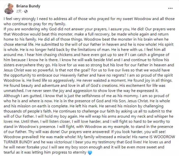 男童的母親邦迪(Briana Bundy)在20日在臉書上發貼文說,兒子苦撐了7天,終於不敵病魔於19曰去世。