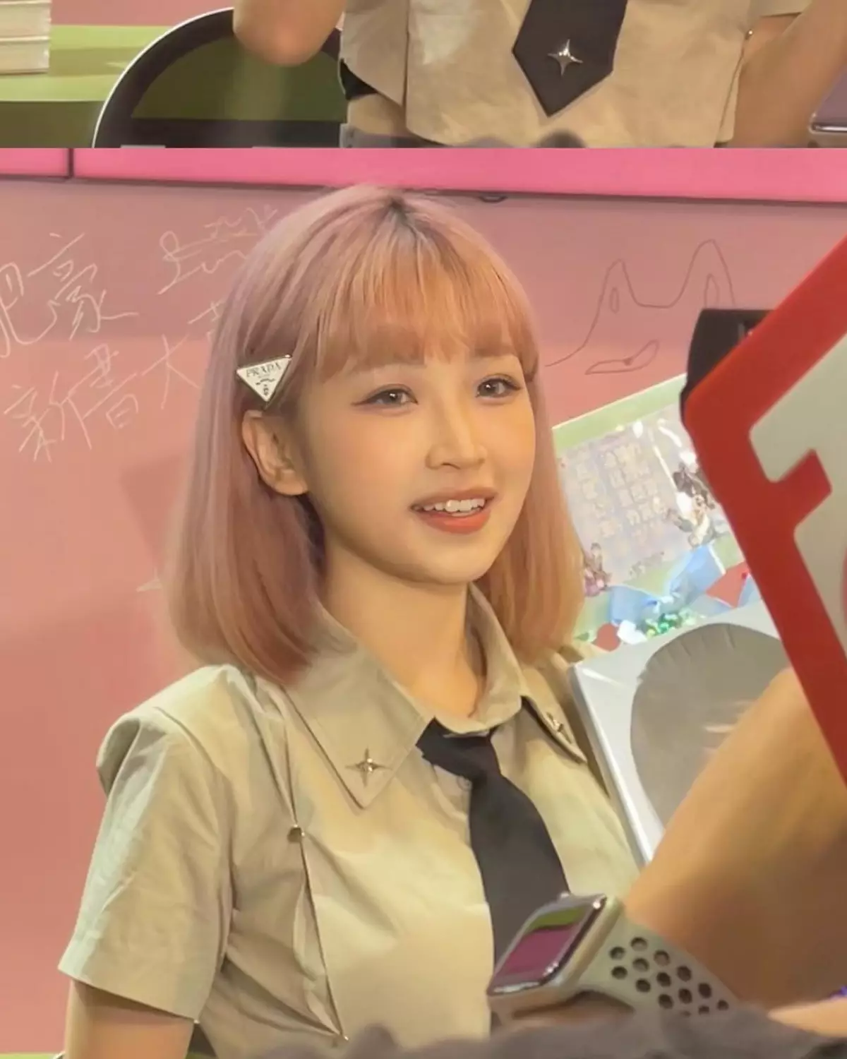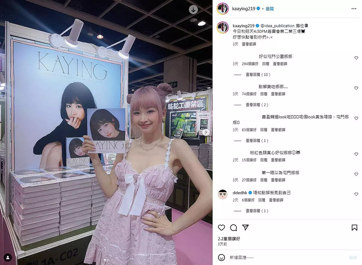 日前,王嘉盈就一頭粉紅色的兩個髻搭配清涼吊帶粉色格子低胸裙去到書展現場進行宣傳,十分調皮可愛,但傲人的上圍相當吸睛,為她的造型增加了性感誘惑。王嘉盈將造型分享到社交平台後,卻引起網友唔同的討論,指王嘉盈個look撞晒「屯門娜娜」,「好似屯門公園娜娜」、「點解變咗娜娜」、「第一眼以為係娜娜」,不過王嘉盈EQ超高,風趣回應:「今日我會帶埋Happy伯!」並標註搭檔德朗,惹網友紛紛點讚。