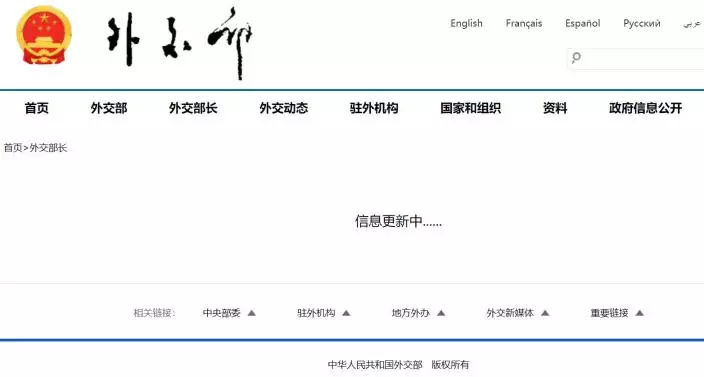 外交部官方網站已經移除「外交部長」欄目所有內容,部長簡歷、致辭、活動、足跡、圖片視頻、講話全文等6個章節,均顯示「信息更新中」。