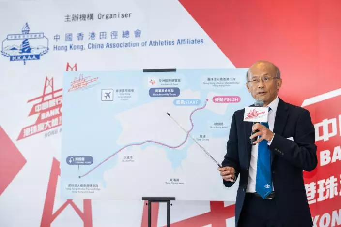 中國銀行(香港)港珠澳大橋香港段半馬拉松籌備委員會主席楊世模於發布會上介紹首屆「中國銀行﹙香港﹚港珠澳大橋香港段半馬拉松」路線。