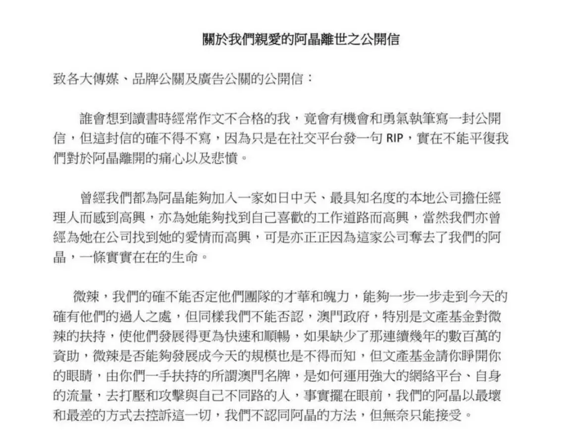 人氣YouTube頻道「微辣」的前經理人阿晶(Jane)7月26日傳出輕生的消息,並在社交平台揭露自己抑鬱纏繞4年,控訴遭「微辣」滅聲,而且曾遭恐嚇、網絡欺凌,並撰寫千字文遺書。其後,微辣發出聲明,證實「前員工」阿晶的死訊,網民幾乎一面倒斥微辣「害死人」,紛紛表示要抵制微辣,至27日,品牌宣布與微辣割蓆。