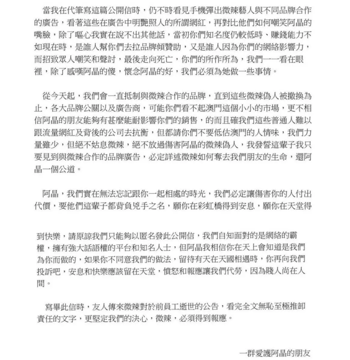 另一方面,阿晶的離世,令網民幾乎一面倒斥微辣「害死人」,紛紛表示要抵制微辣,網上更流傳一封來自「一群愛護阿晶的朋友」的公開信,稱必須為阿晶做一些事,「看著這些在廣告中明艷照人的所謂網紅,再對比他們如何嘲笑阿晶的嘴臉,除了嘔心我實在講不出其他話,當初你們知名度仍較低時、賺錢能力不如現在時,是誰人幫你們去拉品牌傾贊助,又是誰人因為你們的網絡影響力,而招致眾人嘲笑和聲討,最後走向死亡。」