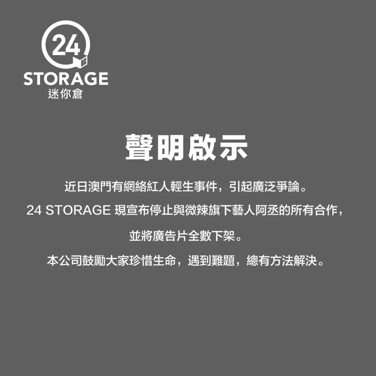 迷你倉「24 STORAGE」發聲明宣布停止與微辣旗下藝人阿丞的所有合作,並將廣告片全數下架,「近日澳門有網絡紅人輕生事件,引起廣泛爭論。24 STORAGE 現宣布停止與微辣旗下藝人阿丞的所有合作,並將廣告片全數下架。本公司鼓勵大家珍惜生命,遇到難題,總有方法解決。」與此同時,《微辣十周年》的贊助商「247 FITNESS」亦宣佈停止贊助及相關宣傳,並表示:「願逝者安息」。