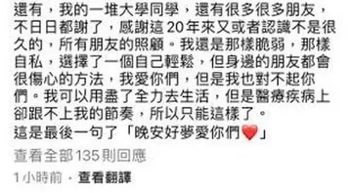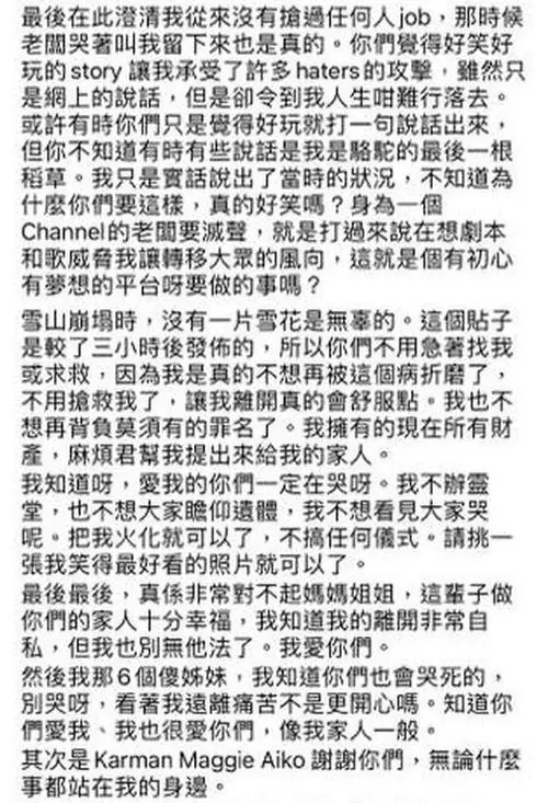 到26日下午, 阿晶發布預設時間的千字文遺書,自爆因墮胎而患上抑鬱症,「抑鬱症對我來說太難受了,基本上每天都是在黑暗中沉淪……從不要小朋友開始,我就被這個病纏上。活著對我來說狼狽不堪。」又透露自己在病發時遭到冷待,「在初期知道有病時我哭著求身邊的人不要走,能不能抱著我,我快要暈過去了,他只是冷冷丟下一句『你很恐怖,有病就吃藥,別像個瘋子一樣』然後就丟下我一個人走了,自此之後發病我都是一個人在房間哭,我也不想大家看見這麼失態的我。連當時最親近的人都受不了,所以我決定在無數過撐不下去的黑夜,自己一個人面對哭泣。」