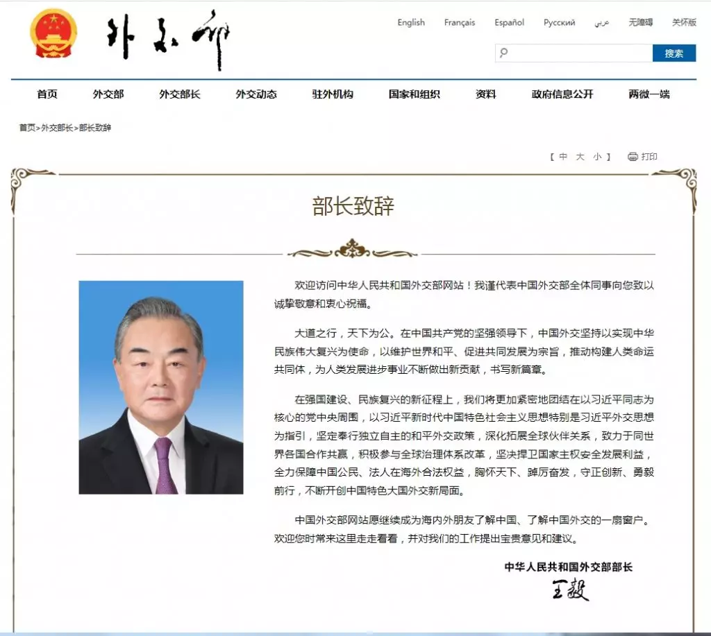 王毅在「部長致辭」一欄中提到,代表中國外交部向到訪網站的人士致以誠摯敬意,又說在中國共產黨的堅強領導下,中國外交堅持以實現中華民族偉大復興為使命,以維護世界和平、促進共同發展為宗旨,推動構建人類命運共同體,為人類發展進步事業不斷做出新貢獻。