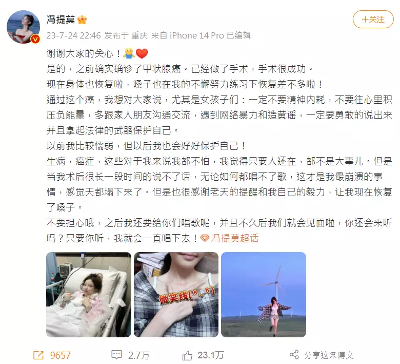 24日,馮提莫在社交平台上發文承認自己患上甲狀腺癌晚期,透露現在已完成手術,身體逐漸恢復。她形容手術後有很長一段時間無法說話和唱歌,「感覺天都塌下來了」,好在經過手術後聲音已恢復,亦表示會繼續唱歌。
