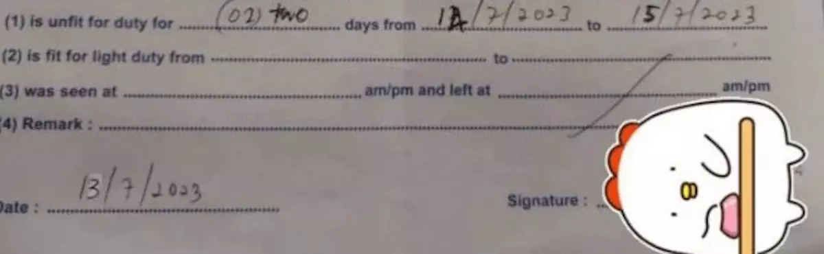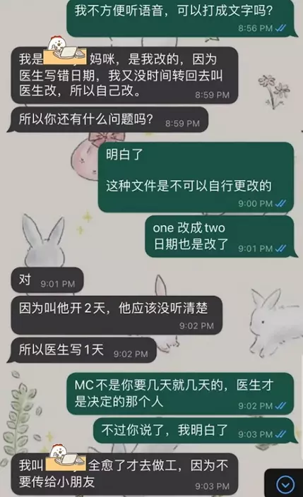 該僱主於Facebook專頁發帖,表示想提醒年輕人MC(Medical Certificate,病假紙)是不能自己更改。事緣其公司有位仍在試用期的女員工,居然自行修改病假紙多放1天病假。因為病假紙有明顯修改痕跡,便詢問對方發生什麼事,不料回覆者竟是對方母親。從僱主提供的對話截圖顯示,他指病假紙「one改成two,日期也是改了」,該員工的母親承認確是修改了,不過卻將責任推卸予醫生,斥是醫生沒有聽清楚女兒需要2天病假,因而寫錯1天,而她沒有時間回去請醫生修改,於是就自行塗改,其後更反過來問僱主:「所以你還有什麼問題嗎?」