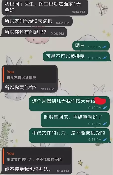 該名母親更理直氣壯稱,「我叫她痊癒才去做工,因為不要傳染給小朋友」,加上有詢問醫生意見,覺得1天未必能完全康復,故要請2天假。僱主表示明白,「可是不可以被接受」,對方無禮質問「所以你要怎樣?」。眼見對方不知悔改,僱主亦不想和對方糾纏,便主動提出結束僱員關係,「這個月做到幾天我們按天算,制服拿回來」,並再次重申「竄改文件的行為是不能被接受的」,可惜對方只晦氣稱「你不接受我也沒辦法」。
