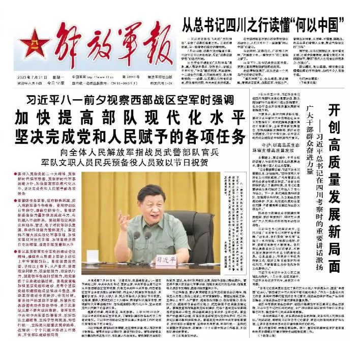 《解放軍報》發表評論員文章,指中央軍委主席習近平在八一建軍節來臨之際視察西部戰區空軍,必將加快提高部隊現代化水平,堅定完成黨和人民賦予的各項任務。
