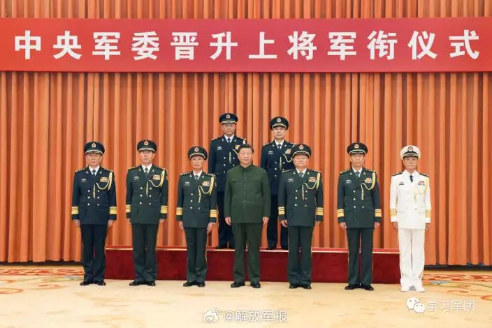 晉升軍銜儀式結束後,習近平等領導人同晉升上將軍銜的軍官合影。