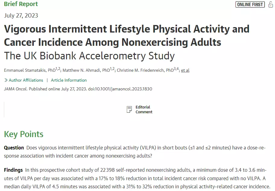 悉尼大學教授伊曼紐爾 (Emmanuel Stamatakis) 表示,增加鍛煉是「降低癌症風險的一項有前途的免費建議」。他解釋稱,日常生活中總共只需四分半鐘的劇烈活動,就可以將患癌症的總體風險降低18%,而患某些癌症的風險與體力活動減少高達32%。