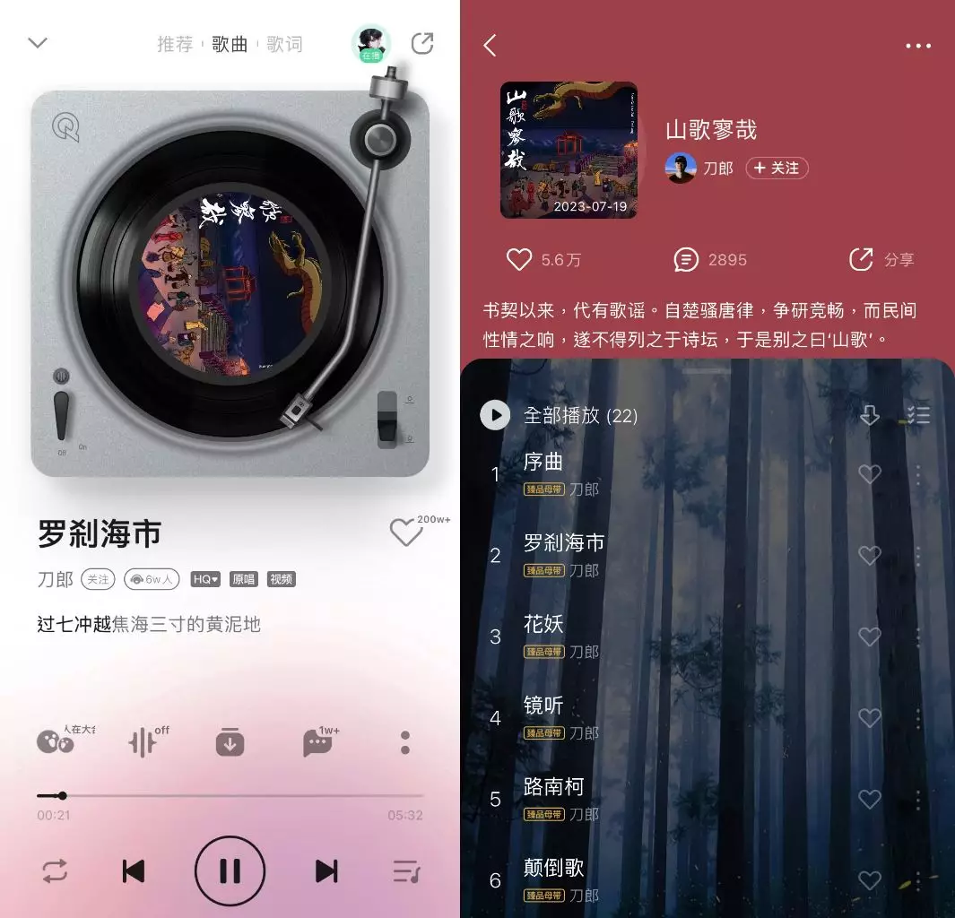 刀郎曾經憑藉專輯《2002年的第一場雪》紅遍全國,一度到咗人人都識唱的地步,連譚詠麟都忍唔住翻唱,最終,該專輯以270萬張的銷量登頂華語樂壇榜,但好景不長,刀郎其後的新歌發布都反響平平,此次爆紅新歌《羅刹海市》是刀郎最新發布的專輯《山歌寥哉》中的其中一首,其中收錄的歌全與蒲松齡的《聊齋》有關。