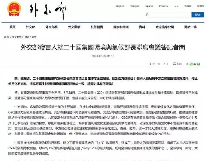 在北京,外交部8月2日反駁有報道指,中方立場阻礙二十國集團環境與氣候部長聯席會議,就減排、停止使用化石燃料、提高可再生能源利用等關鍵問題達成共識,指有關報道觀點與事實完全不符。
