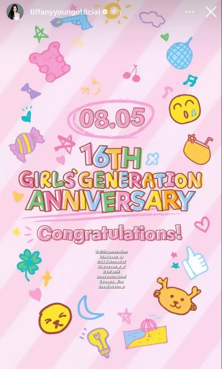 少女時代八位成員太妍、Sunny、Tiffany、孝淵、Yuri、秀英、允兒和徐玄,2017年Tiffany、秀英、徐玄三人宣布不與SM娛樂續約,但強調組合並不會解散,而五位留在SM娛樂的成員太妍、Sunny、孝淵、Yuri和允兒,亦曾以「少女時代-Oh! GG」名義推出專輯活動。去年夏天少女時代八人曾合體發表15周年紀念專輯和舉行連串活動,團隊之間的默契和感情毋庸置疑。而Tiffany於5日在社交網限時動態轉發圖片時,亦有一併標註其他7位隊友名字一齊慶祝。