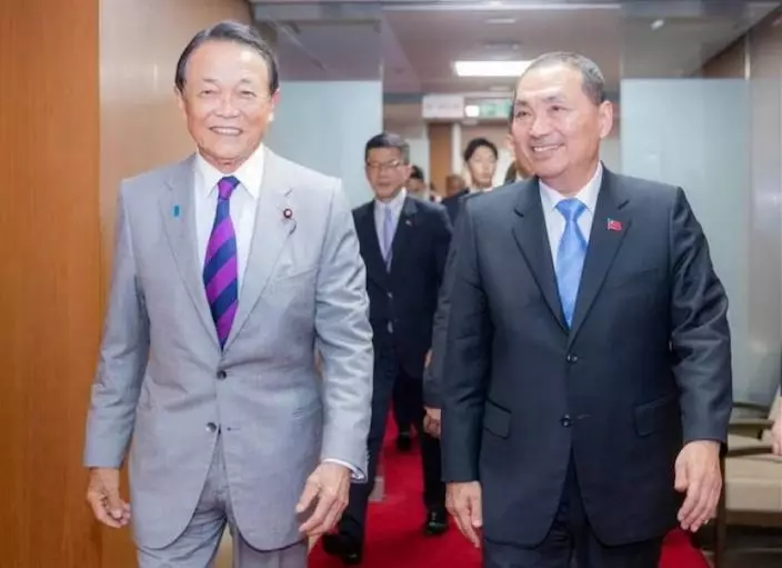 侯友宜(右)訪日時,與前日本首相麻生太郎(左)會談後並肩走出。