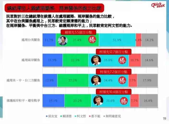 在這份民調中,還有一份數據格外引人關注,那就是在「維護兩岸和平,避免衝突戰爭」的調查上,柯文哲以33.6%位居第一,賴清德與侯友宜則以23.2%、19.1%分列二三位。