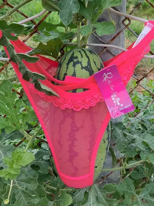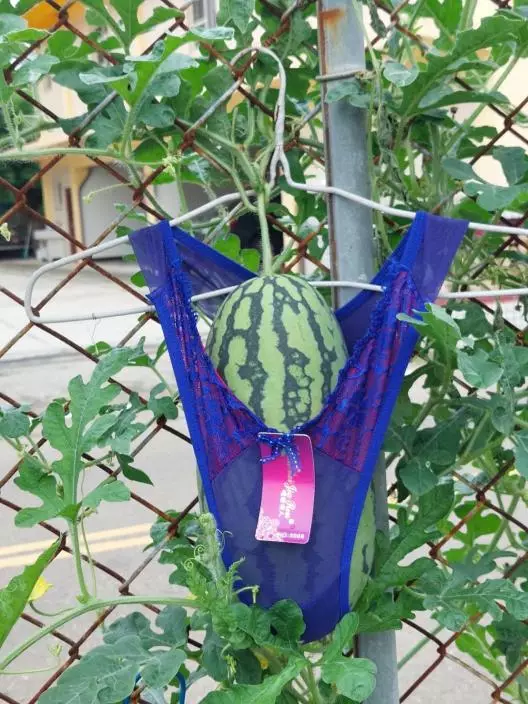 該網民寫道,農場主人將數顆西瓜裝在衣架與五顏六色蕾絲內褲製作的高架裝置內,讓他覺得十分有趣便拍照分享出來。