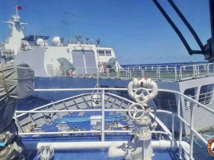 菲律賓海岸警衛隊發放的圖片,中國海警在南沙仁愛礁海域,攔阻菲方補給船和海警船。(AP資料圖片)