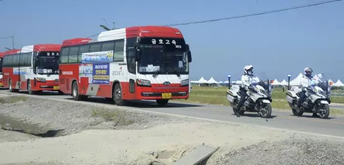 韓媒報道,參加者分別乘坐過千架旅遊巴,前往首爾、京畿道、全羅北道、忠清南道和忠清北道等8個地方。(AP圖片)