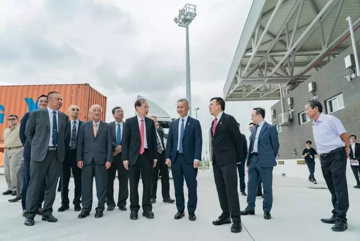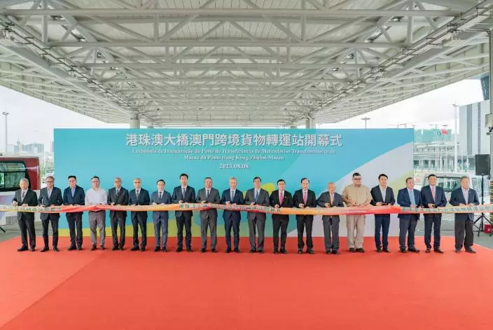 港珠澳大橋澳門跨境貨物轉運站開幕儀式於今(8)日上午舉行。經濟及科技發展局戴建業局長、澳門特別行政區海關李煜輝助理關長、交通事務局鄭岳威副局長,以及行業商會領導共同主持開幕式。