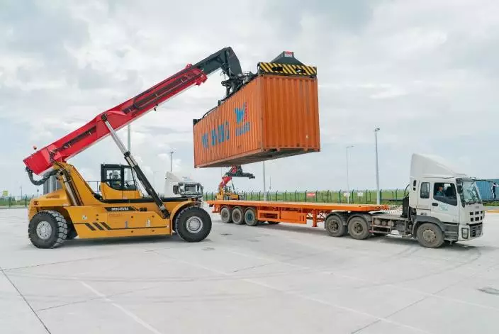 吊運車將香港貨櫃吊裝至澳門貨車,象徵轉運站的啟動。澳門新聞局圖片